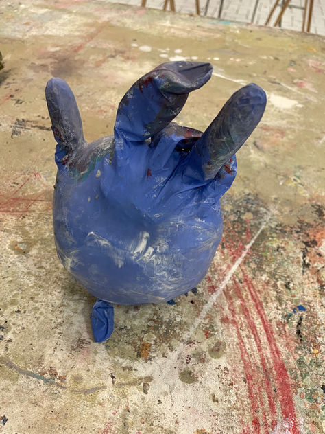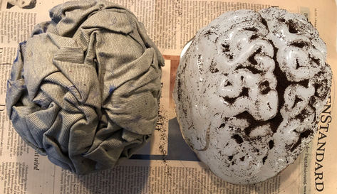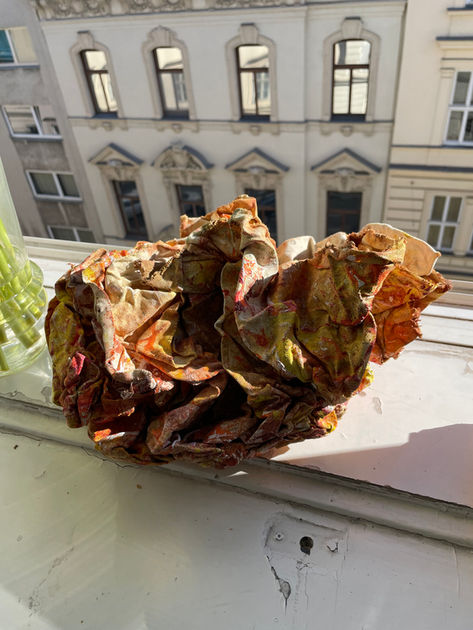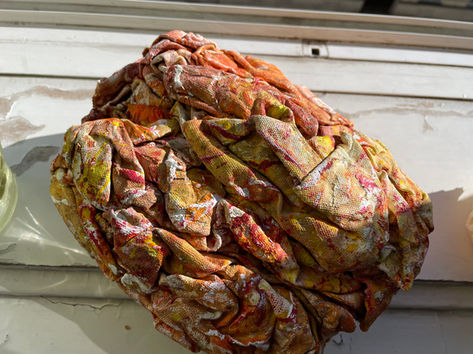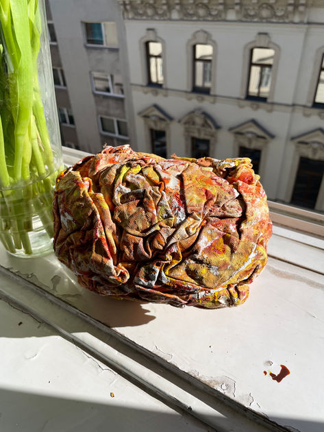Auf der Suche nach Möglichkeiten, die zweidimensionale Malerei in die dritte Dimension zu überführen, entwickelte ich die Idee zu meinen Faltenbildern. Diese entstehen in einem spannenden Prozess, in dem ich ein fertig gemaltes Bild mit reiner Körperkraft zu einer Kugel zusammendrücke, die Form fixiere und in diesem Zustand trocknen lasse – dieser Fetzenschädel ist ein Übergangsobjekt, ein vergänglicher Zwischenschritt für ein „Leben danach“ als Faltenbild.